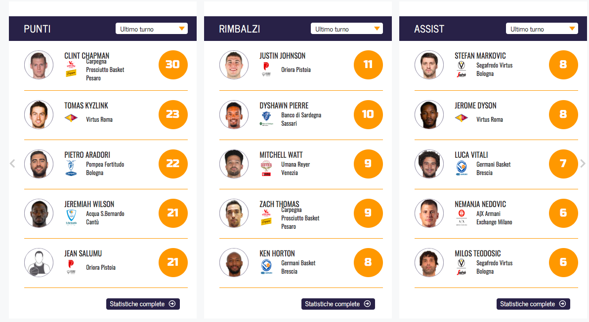 Treviso se llevó el duelo ante Pesaro, 85-75. De nada sirvió el partidazo de Chapman, 30 puntos, 5 rebotes y 35 de valoración. Destacados de Treviso, Fotu con 17 puntos y 6 rebotes, y Tessitori con 18 puntos y 7 rebotes. Por su parte, Brescia logró ganar como visitante en la cancha de Fortitudo Bologna, 88-74, gracias al buen hacer de Horton y Laquintana. Cerró la jornada el encuentro entre Cremona y Cantú, que acabó con victoria del Cantú, 54-78, con un excelso Wilson 21 puntos, 8 rebotes y 26 de valoración.