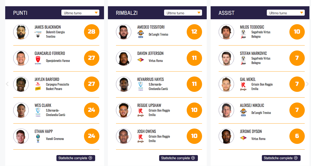 – Giancarlo Ferrero: El jugador italiano, capitán de Varese tras su quinta temporada en el club, ha sido MVP de la jornada a sus 31 años tras un excelso partido, 27 puntos, 8 rebotes, 2 asistencias y 35 de valoración. Debutó en 2003 con Casale Monferrato, donde logró el ascenso a la Serie A2 y ganar la Copa de la Serie B. Tras tener otras experiencias en otros clubes, en 2009 regresó a Casale, con quienes logró el ascenso histórico a la Serie A. En 2011 debutó con el Sassari en la Serie A pero sin duda, tuvo una gran importancia en la Lega Serie A2, tanto con Casale como Trapani. Ahora en Varese ha encontrado su estabilidad profesional y prueba de ello es el partido de esta jornada. Es de esos jugadores que suman intangibles esenciales para ganar partidos.