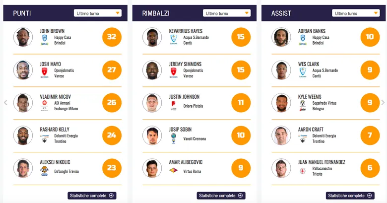 – John Brown: El jugador de Happy Casa Brindisi de 27 años realizó un excelso partido este domingo con 32 puntos, 7 rebotes, 2 asistencias y 40 de valoración. Su máxima anotación personal y segunda mejor valoración de la historia del Brindisi. El jugador de Florida llegó a Italia de la mano de Virtus Roma tras no ser elegido en el Draft de 2016. Tras una temporada en Roma, jugó el año pasado en Treviso y este año ha encontrado el hueco perfecto en Brindisi. Con experiencia en la liga italiana en los próximos años está por llegar la explosión de este alero de 2,03 m. Seguirle muy cerca.