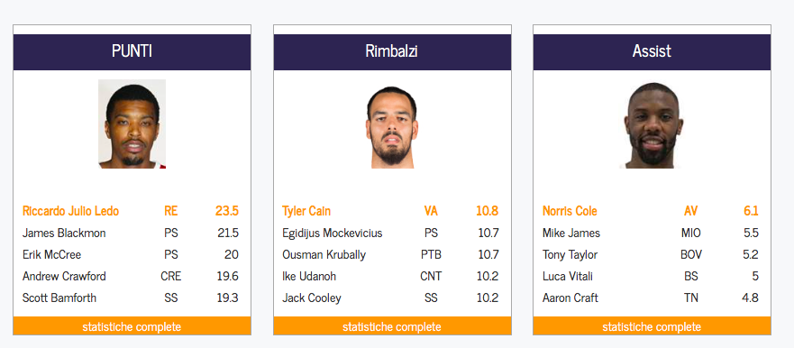 – Dustin Hogue: El jugador de Nueva York de 26 años tras no ser elegido en el Draft de la NBA de 2015, fichó por la liga griega. Tras una temporada llegó a Italia, precisamente a Trentino, el año pasado probó suerte en la liga turca y también en corea. Y ha vuelto a la Legabasket donde va a ser un jugador interesante en la lucha de la zona media y baja de la tabla que tiene Trentino. En esta jornada fue clave en la importante victoria ante Reggio Emilia, 21 puntos, 9 rebotes, 2 asistencias y 29 de valoración.