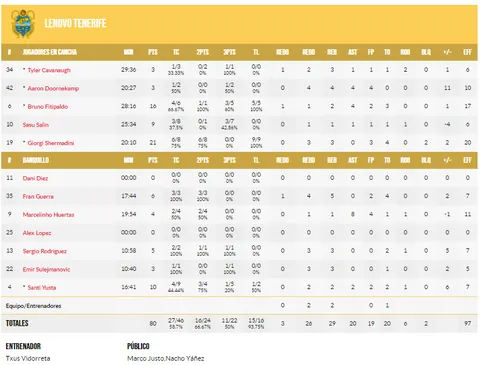 Lenovo Tenerife necesita a Gio Shermadini en su mejor versión en esta recta final de temporada. El pívot georgiano comenzó el encuentro de manera muy discreta, viéndose superado tanto en ataque como en defensa. Con el paso de los minutos el interior fue asumiendo más galones, hasta el punto de ser decisivo en el último cuarto. Shermadini finalizó el encuentro con 21 puntos, 3 rebotes y +20 de valoración. Mencionar también a Jackie Carmichael, que a pesar de lograr 26 puntos, 7 rebotes y 2 asistencias, su equipo no se pudo llevar la victoria.