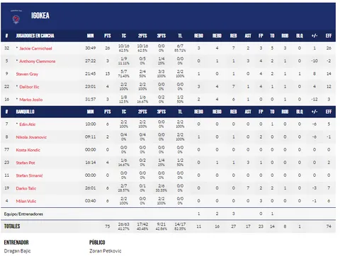 Una de las principales amenazas del Igokea en el partido de hoy fue Jackie Carmichael. El pívot estadounidense, de 31 años y con pasado en el Bilbao Basket, hizo sufrir a la defensa aurinegra, dejándonos jugadas de calidad como este mate con reverso incluido sobre línea de fondo.