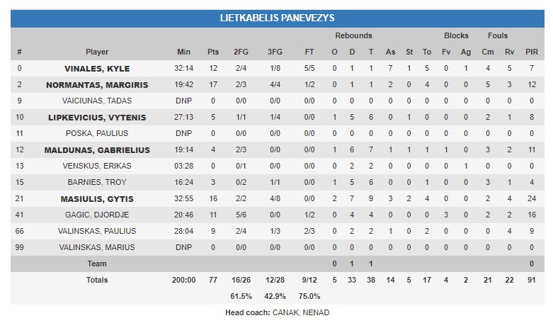 En líneas generales el Lietkabelis hizo un gran partido, tanto en ataque como en defensa. Jugadores como Kyle Viñales y Margiris Normantas fueron claves en la victoria, pero la piedra angular del triunfo fue Gytis Masiulis. El ala pívot, formado en la cantera del Zalgiris Kaunas, está afrontando su primera campaña en el equipo de Panevezys, y con partidos como hoy se explica la buena cantera que consigue sacar año tras año el Zalgiris Kaunas. En esta ocasión, el número 21 acabó el encuentro con unas estadísticas de 16 puntos, 9 rebotes, 3 asistencias y un acierto del 50% en T3 (4 de 8), sumando un total de +24 créditos de valoración.