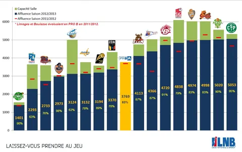 El color verde indica la capacidad del pabellón; la línea roja, la asistencia de público en la temporada 2011-12, y la zona azul, la asistencia en la pasada temporada. Como es lógico, la asistencia tiene que ver con la buena marcha del equipo (véanse los casos de Paris-Levallois y Chorale Roanne), pero también permite realizar una radiografía de las aficiones más fieles y que casi siempre rozan el lleno, como las de Gravelines-Dunkerque, Limoges o ASVEL.
