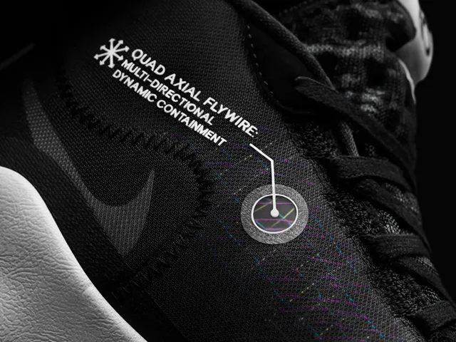 Una de ellas es la introducción del Quad Axial Flywire. Bajo un upper que rinde homenaje a las zapatillas de los años noventa, los cables Flywire están dispuestos en un patrón multidireccional, de manera que reaccionan sea cual sea la dirección que tome el pie en cada momento de juego.