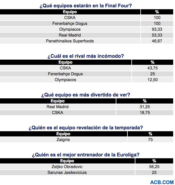 La Euroleague ha hecho pública una encuesta que ha realizado a los directores deportivos de los equipos que participan en la competición, una vez cumplida la mitad de la temporada. La preguntas han ido dirigidas en el contexto de la próxima Final Four de Belgrado. Tras la pobre campaña que están haciendo los equipos españoles, -listese Barça Lassa, Unicaja, Valencia Basket y Baskonia-, a excepción del Real Madrid, los dirigentes de los clubes ven a los blancos como único equipo a destacar por ser el más divertido de ver jugar y el único que ven con posibilidades de llegar a la F4.