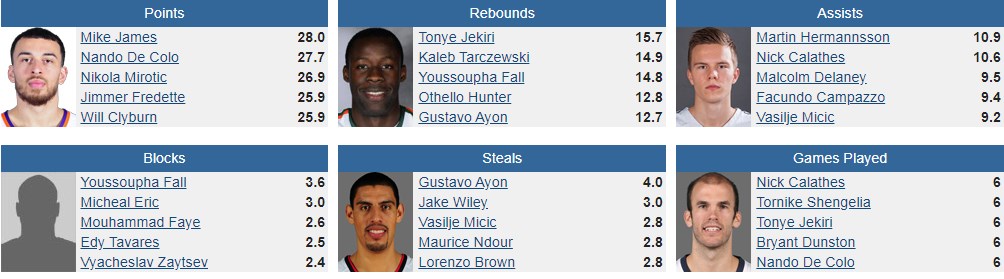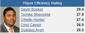 Los interiores dominan el PER con Devin Booker a la cabeza, en una estadística que tiene en cuenta el tiempo que se está en cancha, la producción por minuto y factores diferentes a la valoración que se usa en Europa. El top 5 lo completan Tornike Shengelia, Othello Hunter, Omri Casspi y Gustavo Ayón.
