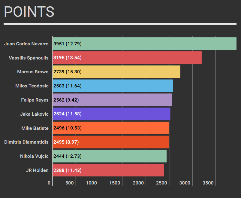 En el Top 10 de anotación figura Juan Carlos Navarro en primera posición con 3951 tantos anotados. En dicho Top figura también Felipe Reyes, que ocupa la quinta posición.