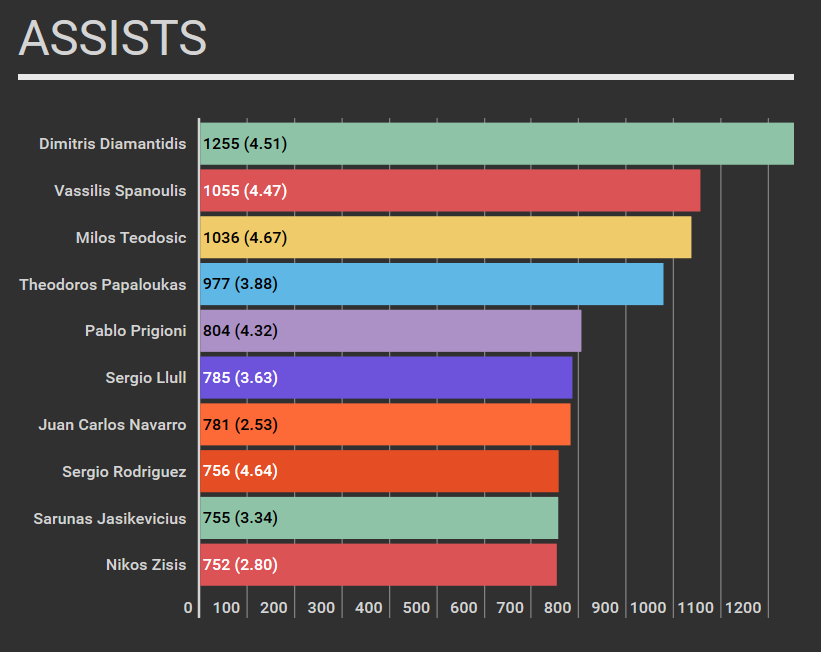 En el apartado de asistencias hay claro dominio heleno con Diamantidis, Spanoulis, Teodosic y Papalokas copando las posiciones de cabeza. El recién retirado Pablo Prigioni ocupa el quinto puesto con 804 asistencias, seguido por los tres españoles en el top 10: Sergio Llull, Juan Carlos Navarro y Sergio Rodríguez, este último con un promedio destacado de 4.6 asistencias por partido.