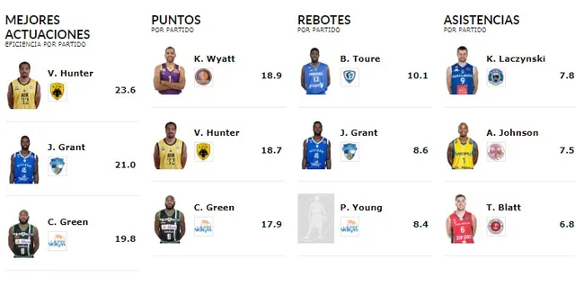 Hay que destacar que en los puestos más altos de las principales estadísticas no figura ningún jugador de Iberostar Tenerife o UCAM Murcia, ya que ambos equipos han cimentado su fantástica campaña en esta competición europea en un trabajo coral de toda la plantilla y permitiéndose en ocasiones dar minutos a jugadores que cuentan con menos protagonismo en ACB. La demostración clara de este hecho es que el primer jugador en aparecer en la estadística de valoración es Sebas Saiz en el puesto 28 con 14’2 créditos.