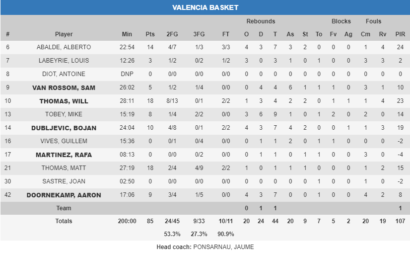 2. Los ‘Thomas’ toman el control. De nuevo, Valencia Basket tiene en Will Thomas y Matt Thomas a sus mejores hombres. Los dos anotaron cada uno 18 puntos y fueron los máximos anotadores del partido, además de liderar a los suyos de diferente manera en ataque. El primero, gracias a su intensidad y contrataques, y el segundo con su acierto exterior en la primera parte, que le hace ser importante en el esquema de Ponsarnau. Ambos son hombres a confiar cuando tienen el balón en sus manos, pues son señal de acierto.