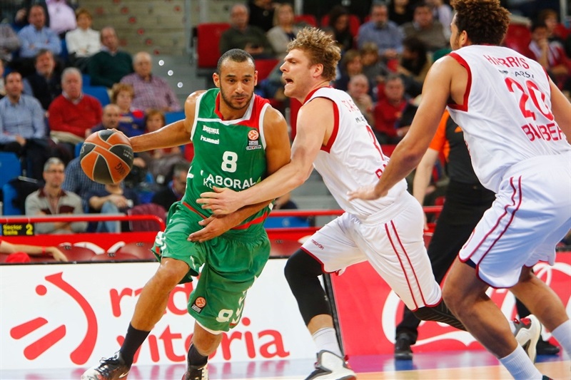 El segundo cuarto continuo en la línea del primero. Mike James cogió el testigo de su compañero Bourousis y con 9 puntos en este periodo evitó cualquier sorpresa del Brose Basket. Nada pudo hacer un entonado Zisis que tiraba con ahínco del un equipo que seguía perdido en la cancha. Al descanso, un 49-30 (coronado con una canasta final de Hanga llena de calidad) que mostraba el dominio local. Más espectacular aun sería la diferencia de valoración: 64 para el Laboral Kutxa frente a los 24 de Brose Basket Bamberg.
