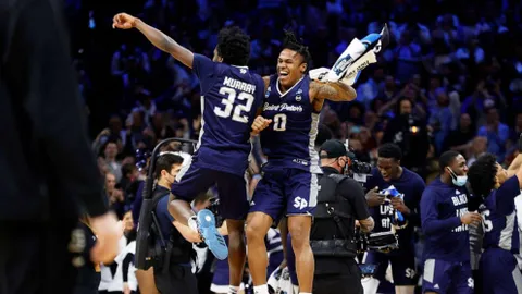 En la otra semifinal de la región se enfrentaban uno de los grandes favoritos a acceder a la Final Four, Purdue Boilermakers, frente a la cenicienta del torneo, Saint Peter’s Peacocks. En este partido, los de New Jersey eran capaces de mantener la igualdad ante una Purdue en la que Jaden Ivey se mostraba especialmente desacertado, pero, aun así, dominaban, de manera que la mayor diferencia para los Boilermakers llegaba a final de la primera parte con el 33-29 al descanso. Tras el paso por vestuarios, rápidamente igualarían el choque los Peacocks, paridad que se mantendría a lo largo de toda la segunda mitad, con los Boilermakers mandando ligeramente en el marcador hasta que, a falta de 2 minutos y con Daryl Banks III como figura (14p), los de Shaheen Holloway daban la vuelta al marcador y lograban el primer pase al Elite 8 de un seed 15 en la historia, con un marcador de 67-64.