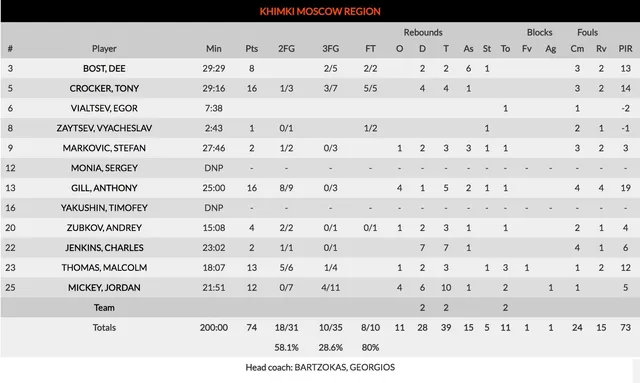 Fue baja en el último momento y, como era de esperar, pasó factura a su equipo. Los jugadores interiores estuvieron correctos durante todo el partido e incluso tuvieron minutos muy buenos, pero faltaron referencias desde el exterior (10/35 en triples). Solamente el ímpetu de Tony Crocker (16 puntos) fue una auténtica amenaza desde el perímetro para el Khimki, que acabó echando de menos más puntos desde ahí. Tampoco es algo que nadie se esperase.