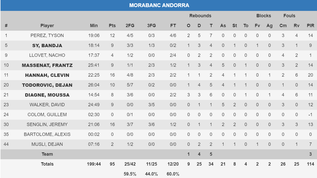 - Clevin Hannah, líder de Andorra: el base estadounidense guio a los suyos en esta victoria, destacando sus minutos en el tercer cuarto. 16 puntos, 4 asistencias y 20 de valoración. Senglin apuntilló a los franceses desde el triple.