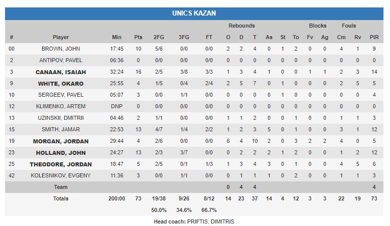 Unics Kazán es un claro candidato a luchar por el título de la Eurocup, aunque parece que tanto el Joventut de Badalona como la Virtus Bologna están un paso por delante del club ruso. Sin embargo, en el partido de hoy han demostrado que son un conjunto muy sólido y con grandes jugadores, como Jordan Theodore, Jordan Morgan o Jamar Smith. Sin embargo, el jugador más destacado de la noche de hoy fue Isaiah Canaan, base que llegó este verano a la entidad rusa tras varios años en la NBA. El ex de Phoenix Suns y Houston Rockets, entre otros, acabó el partido con 16 puntos, 4 rebotes, 1 asistencia y +14 de valoración, siendo así el MVP del partido y el mejor jugador del equipo ruso.