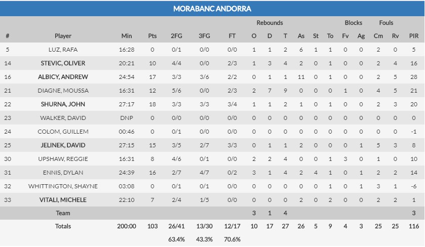 Cuando Albicy anota y asiste, Andorra es otro equipo. El base francés es clave en MoraBanc y esta temporada había empezado de forma irregular y con algunos problemas para encontrar la química con Dylan Ennis. Tras unos primeros partidos fallando mucho en el tiro, mejoró al dedicarse a asistir, pero su mejor versión siempre ha sido cuando es capaz de aportar en ambas facetas. Hoy ha sido el MVP de su equipo con un fantástico doble doble de 17 puntos y 11 asistencias para 28 de valoración. Ha involucrado a todos sus compañeros como demuestra el hecho de que hasta otros cinco jugadores alcanzaron o superaron la decena en puntos.