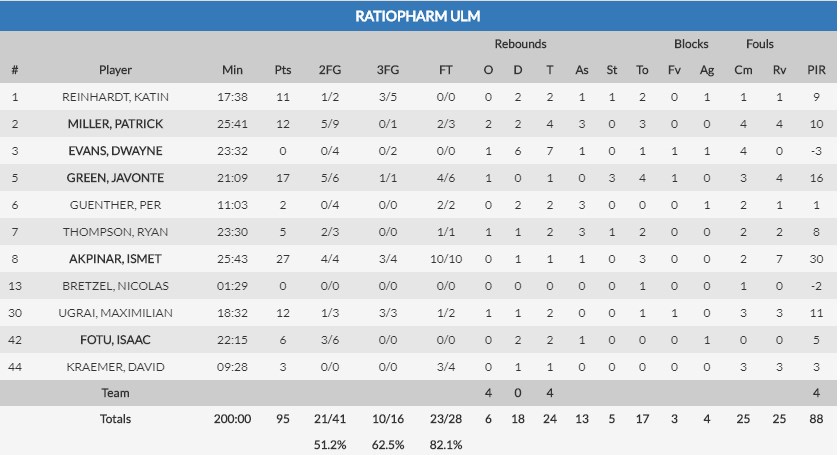 Ismet Akpinar, casi infalible. El mayor motivo de que Ratiopharm no se dejara ir tras la remontada de los de Ibon Navarro en el segundo cuarto fue el espectacular partido de su joven exterior formado en la cantera de Alba Berlín. Anotó 27 puntos con solo un fallo en el tiro: 4 de 4 en tiros de dos, 3 de 4 en triples y 10 de 10 en tiros libres.