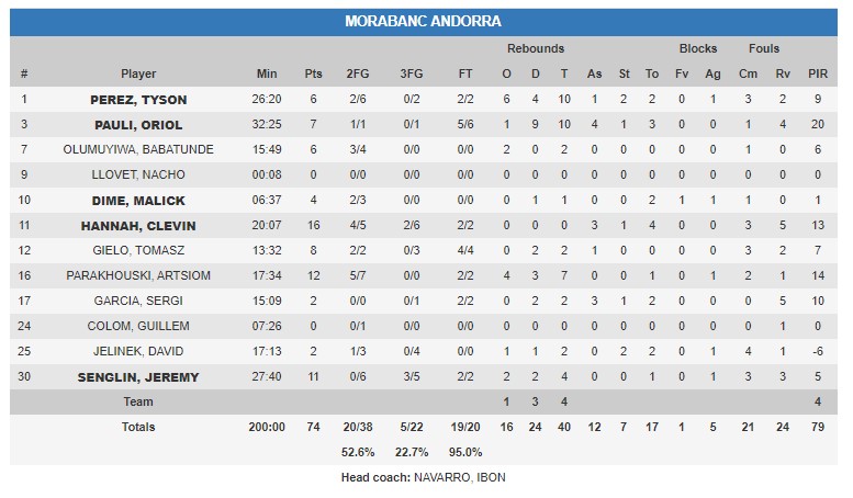 Clevin Hannah y Artsiom Parakhouski fueron dos de los principales líderes del conjunto visitante para que estos lograsen la victoria. Sin embargo, el MVP del encuentro fue Oriol Paulí, jugador recién llegado este verano al conjunto tricolor. El ex del Herbalife Gran Canaria terminó el encuentro con 7 puntos, 10 rebotes, 4 asistencias, 1 robo y +20 créditos de valoración, siendo el jugador más valorado del encuentro. Además, el alero catalán puso la firmeza desde el tiro libre, sumando cinco de los seis intentos que tuvo.
