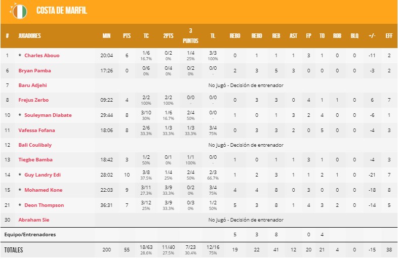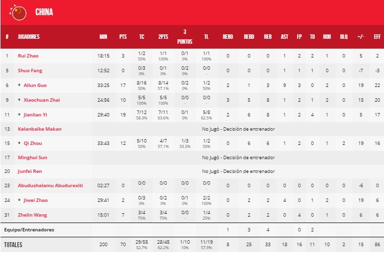 En el tercer cuarto, los locales pegaron el estiron y lo mantuvieron en el último período, pero no fue hasta los últimos minutos cuando se despegaron por completo. La diferencia de 15 puntos es engañosa ya que hubo más igualdad que la que señaló el marcador final. Jianlian Yi fue el líder de la ofensiva con 19 puntos, pero más destacado fue Ailun Guo, con 17 puntos, 9 asistencias y 22 de valoración. Estuvieron bien acompañados por Qi Zhou y Xiaochuan Zhai. En Costa de Marfil solo Guy Landry Edi alcanzó la decena en puntos y nadie lo hizo en valoración, con un decepcionante partido de Deon Thompson (7 y 5) que estuvo muy fallón ante las torres chinas.