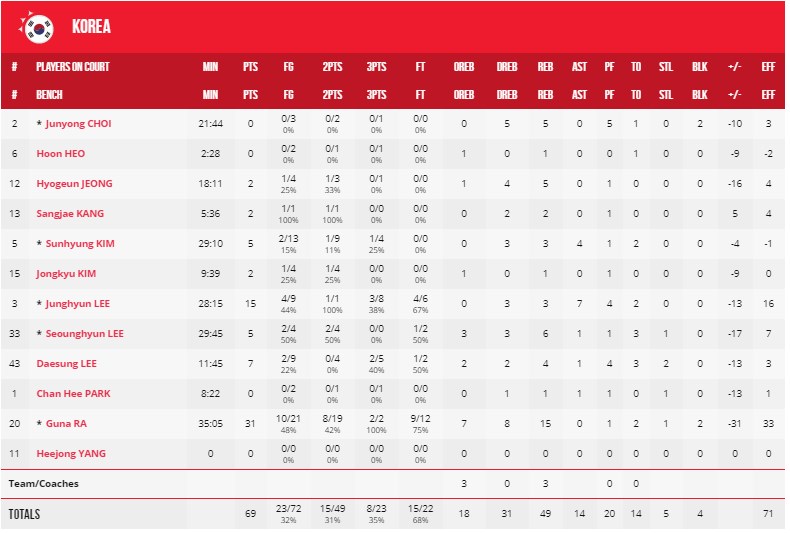 Por parte coreana se produjo lo que puede ser una constante en cuanto a exhibiciones individuales con la actuación de Guna Ra (Ricardo Ratliffe) que se fue a 31 puntos, 15 rebotes y 33 de valoración. El que destacábamos como su mejor escudero, Junghyun Lee, también hizo un buen partido con 15 puntos, 7 asistencias y 16 de valoración.