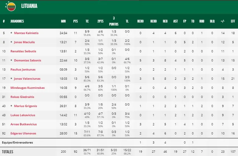 Los lituanos han vuelto a demostrar la injusticia de que muchas veces no se cuente con ellos en los pronósticos. Tienen un equipo muy bien armado, con la pareja interior formada por Valanciunas y Sabonis dominando las zonas, dirigidos por un Kalnietis que siempre sube su nivel con la selección, y con muchos jugadores aportando. En esta ocasión los escuderos destacados fueron Ulanovas (15 puntos) y Lekavicius (11).