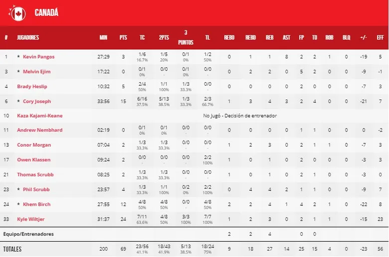 | CANADÁ | KYLE WILTJER | 24 | 3 | 1 robos | 23 | ||
