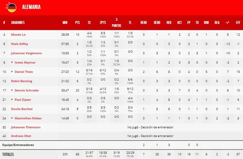 Jugadores como Roberts o Eloy Vargas se impusieron en el interior a los talentosos Voigtmann y Kleber, mientras solo el luchador Theis les daba réplica. En el duelo ofensivo exterior, Schroder anotó 20 puntos, pero con un 5 de 18 en tiros de campo, mientras que Victor Liz hacía lo necesario para que su equipo ganase con 17 puntos (7/14), 5 rebotes y 4 asistencias. Los alemanes pudieron ganar con un tiro de Barthel en el último segundo desde el triple, pero la fortuna fue propicia con quienes la buscaron con más intensidad. Gran éxito del Che García, que es el seleccionador perfecto para exprimir esas virtudes en selecciones de sangre caliente.