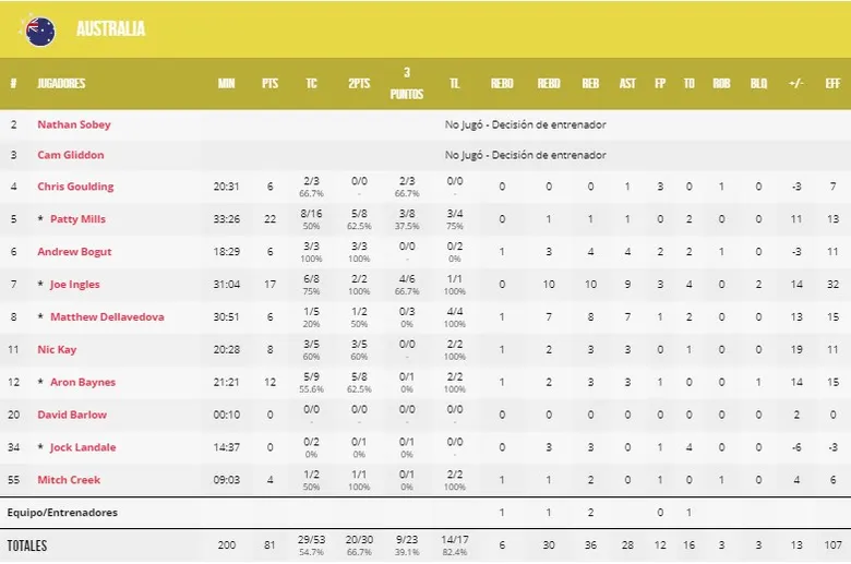 Pero Australia va a por todas en este Mundial y la calidad ofensiva de Mills (22 puntos), el buen trabajo coral con hasta 6 jugadores por encima de la decena en valoración, más la grandísima actuación de un Joe Ingles, que a punto estuvo de lograr el primer triple doble de la historia de una Copa del Mundo con 17, 10 y 9, dieron la clasificación a los oceánicos. Australia entrará directamene en los Juegos Olímpicos de Tokio si Nueva Zelanda pierde contra Grecia en el partido del jueves.