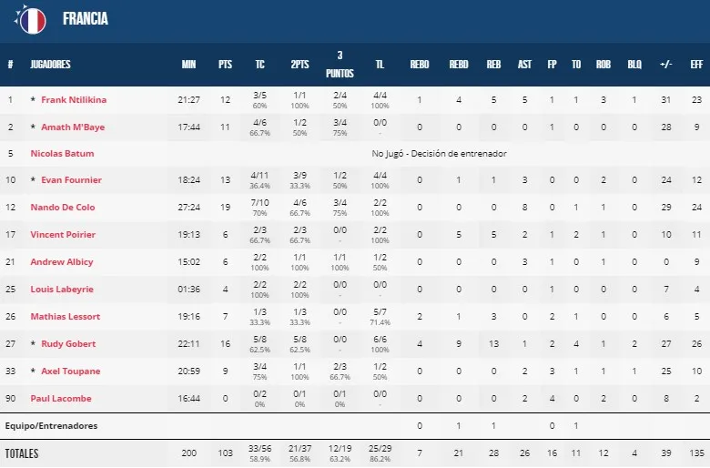 | FRANCIA | RUDY GOBERT | 16 | 13 | 2 tapones | 26 | ||