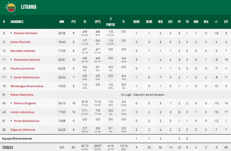 | LITUANIA | DOMANTAS SABONIS | 12 | 4 | 4 asistencias | 19 | ||