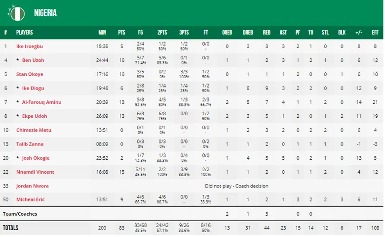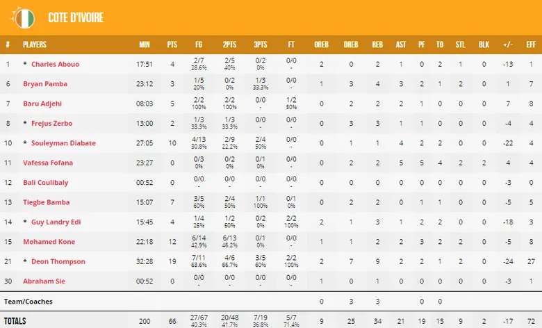 La selección nigeriana desplegó todo su talento ante una selección marfileña que aguantó más de lo esperado. No sería hasta la mitad del tercer cuarto cuando los de Alexander Nwora se marcharían en el marcador asestando un parcial de 26-11 en los diez minutos posteriores a la reanudación. Al-Farouq Aminu sería la principal referencia nigeriana con 13 puntos, 7 rebotes y 4 asistencias mientras que al otro lado de la cancha destacaría el nuevo fichaje de Unicaja, Deon Thompson, con 19 puntos y 9 rebotes.