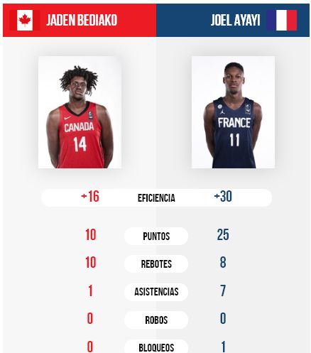 En el último partido de la tarde, saltaría la segunda de las sorpresas, ya que Canadá, pese al buen nombre que traían, Francia les derrotaría con el resultado de 80-85. Joel Ayayi (25 puntos, 8 rebotes y 7 asistencias) daba muestras de lo gran jugador que puede ser y un aviso a los estadounidenses de que no se deben fiar… Siempre y cuando lleguen ambos equipos a la final.