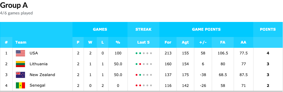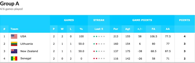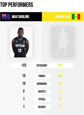 Pese a las extraordinarias actuaciones de Biram Faye (18 puntos y 13 rebotes en el día de hoy), Senegal parece que finalizará la competición como último de su grupo. Su compañero de club en el Herbalife Gran Canaria, Khalifa Diop, fue el segundo al mando durante el partido con 15 puntos y 7 rebotes. Nueva Zelanda, de la mano de Max Darling (doble-doble con 13 puntos y 13 rebotes), recobró la esperanza en la competición con su primera victoria.