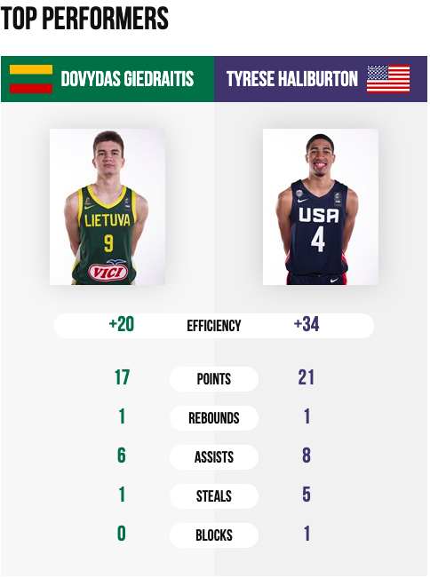 EEUU y Lituania mostraron un encuentro lleno de talento. Pese a la derrota, los lituanos mostraron una de sus mejores versiones, con la aportación de jugadores como Dovydas Giedraitis (17 puntos y 6 asistencias) o Erikas Venskus (19 puntos y 5 rebotes). La estrella del equipo, Rokas Jakubaitis, se quedó a dos asistencias del doble-doble. El tándem Haliburton-Cunningham se marchó hasta los 42 puntos. Jalen Green logró un +17 de valoración y realizó un 4/5 en tiros de campo.