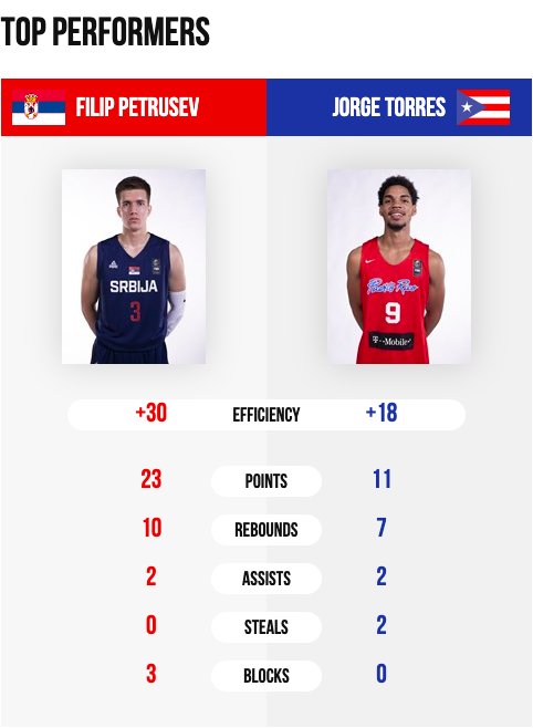 | SERBIA | FILIP PETRUSEV | 75-74 | 23 | 10 | 2 asistencias | +30 | ||