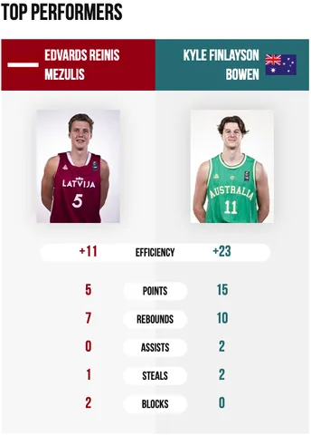 Letonia, por su parte, sigue sin encontrar un líder capaz de llevar a la selección a su mejor nivel. El conjunto de Oceanía, sigue mostrando un gran juego y cada vez más se están conviertiendo en uno de los equipos más a tener en cuenta dentro del Mundial. Kyle Bowen fue el MVP del encuentro con 15 puntos y 10 rebotes.