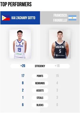 El gigante Kai Sotto, siendo del 2002, está dando un recital de juego en este mundial. Dejando a un lado los resultados de su equipo, está promediando 15 puntos, 9 rebotes y 2.5 asistencias por encuentro y está siendo una verdadera pesadilla para sus rivales. Farabello, en el día de hoy, fue el timón de la selección Argentina con 15 puntos, 4 rebotes y 4 asistencias.