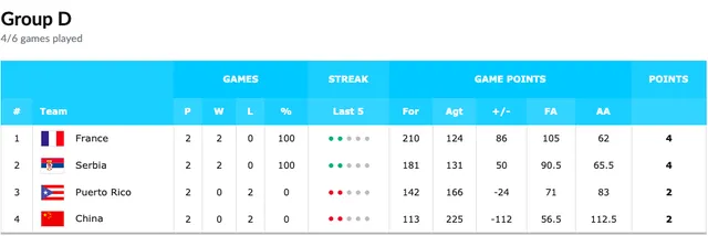 Claramente, las dos selecciones líderes en el grupo D han sido la todopoderosa Serbia y la Francia de Ayayi. Mañana las cuatro selecciones del grupo se juegan una posición clave, para el cruce de octavos, y parece que Argentina gobernará el grupo C. Jugarse los octavos de final contra China, siendo la selección más floja de la competición, puede ayudar a la recuperación del equipo de cara a los cuartos de final.
