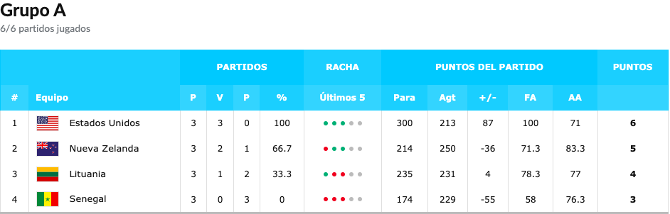 | Grupo A: NUEVA ZELANDA 77-75 LITUANIA SENEGAL 58-87 EEUU | – – |