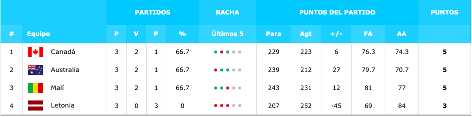 CANADÁ 78-76 LETONIA MALÍ 79-82 AUSTRALIA |
