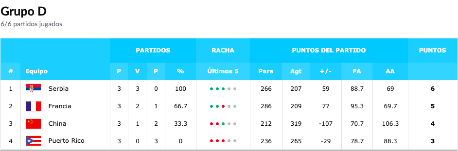 Grupo D: CHINA 99-94 PUERTO RICO FRANCIA 76-85 SERBIA |