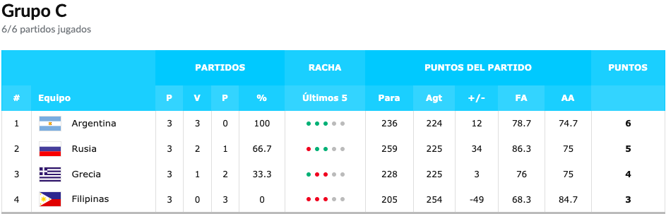 ARGENTINA 73-68 GRECIA FILIPINAS 64-92 RUSIA |