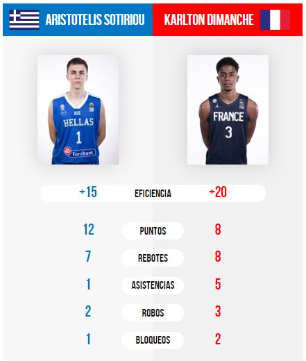 El cuarto y último encuentro de este lado del cuadro, enfrentaba a dos selecciones europeas como Francia y la anfitriona Grecia en un choque que debía mostrar cierta igualdad pero en el que los galos no dieron oportunidad alguna a los helenos y ya desde el comienzo del partido, guiados por su defensa y su físico, junto a las actuaciones individuales de Karlton Dimanche (8 puntos, 8 rebotes, 5 asistencias y 3 robos) y Babacar Niasse (13 puntos con 60% en triples), no daban ninguna opción a los griegos e iban incrementando la distancia según avanzaba el partido para terminar con un marcador de 46-77.