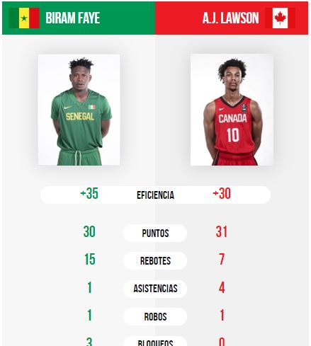 Nuevo rival africano y nuevo partido muy complicado para un conjunto canadiense al que los equipos físicos le están costando mucho trabajo. Sin embargo y al contrario que contra Mali, ésta vez su estrella AJ Lawson (31 puntos, 7 rebotes y 4 asistencias) sí estuvo acertado y consiguió, con la ayuda de Damion Squire (18 puntos y 4 asistencias), superar a la Senegal de un entonadisimo Biram Faye (30 puntos, 15 rebotes y 3 tapones), ya que el jugador del Granca hizo soñar a los senegaleses con la sorpresa en gran parte de un choque que acabaron venciendo los norteamericanos por 79-90.