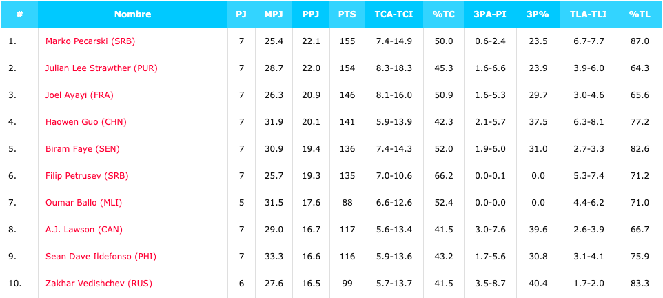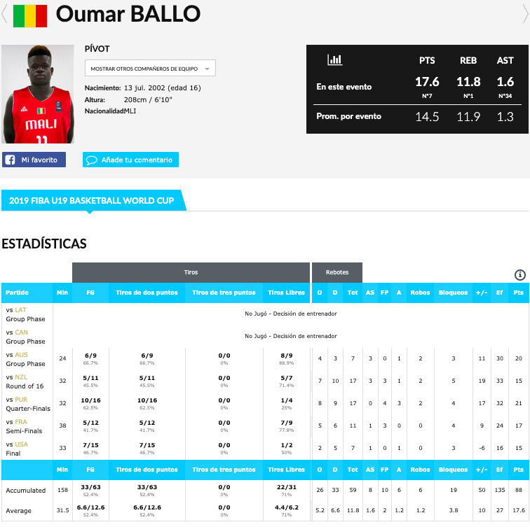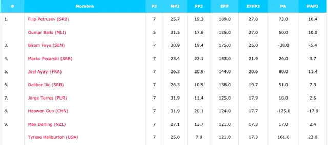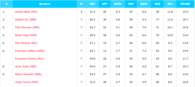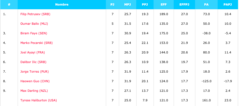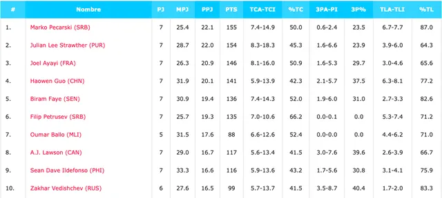 En la parte alta de la clasificación encontramos a Oumar Ballo, miembro del quinteto ideal, con 11.8 rebotes por encuentro. Un merito enorme ocupar esta posición, ya que tras perderse los dos primeros partidos, ha conseguido llevar a Mali a la final del Mundial. La primera selección africana que lo consigue.