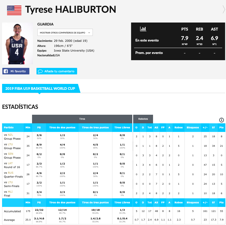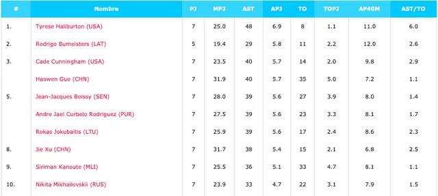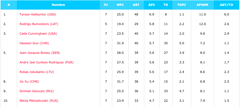 Estados Unidos tiene una de las mayores promesas del mundo entre sus filas. Tyrese Haliburton, siendo el máximo asistente del torneo, ha sido lo suficiente inteligente para saber que su rendimiento en ataque podía proporcionar muchos huecos en las defensas de los rivales. Sus compañeros ha sabido generar muchos puntos gracias a sus asistencias.