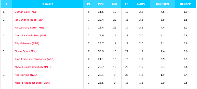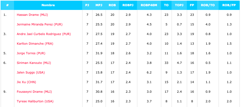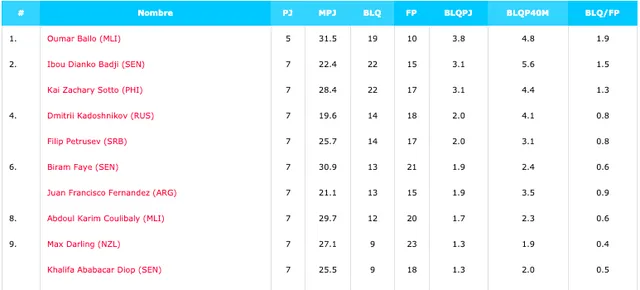 A lo largo de esta categoría, podemos observar jugadores menos destacados en otras estadísticas. En el TOP 10, podemos encontrar hasta 3 jugadores de Mali y 2 de EEUU, lo que quiere decir que 5 de los 24 jugadores que disputaron la final pertenecen a este grupo. Destacar también la aparición de hasta tres jugadores de Puerto Rico.