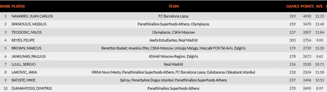 La pasada jornada superó a Diamantidis como líder de dicha clasificación. El escolta catalán disputó más de 15 minutos frente al CSKA que terminó con victoria para los de Sito Alonso. Hasta el viernes pasado era Diamantidis quien había jugado más minutos en la Euroleague con un total de 7967:49 minutos. En estos momentos es Navarro quien más minutos ha jugado en la Euroleague con 7976:52. Además el eterno número 11 del Barcelona cuenta con el resto de la temporada para ampliar esta cantidad de minutos.