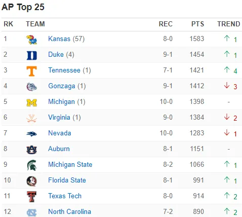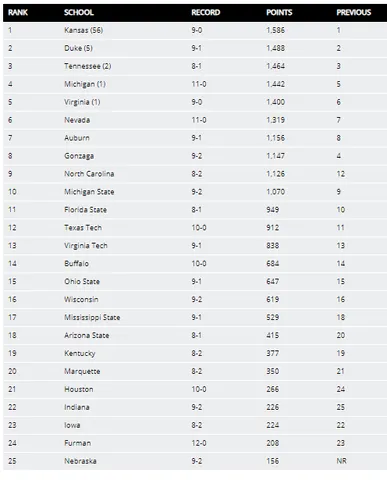 En unos últimos ocho días sin demasiados partidos debido a la necesidad de realizar los exámenes de final de semestre, los tres primeros del ránking, Kansas, Duke y Tennessee han vivido sin demasiados sobresaltos, siendo los número 1 del país el equipo que más complicaciones ha tenido ya que el sábado recibieron en el Phog Allen al actual campeón Villanova Wildcats a los que en un disputadísimo partido lograron vencer por 74-71 con unos inspirados LaGerald Vick (29 puntos y 7 rebotes) y Dedric Lawson (28 puntos y 12 rebotes), para posteriormente, la pasada madrugada, tener un partido más placido ante South Dakota a la que vencieron sin problemas por 89-53. Mientras tanto, los Blue Devils solo han disputado un choque frente a Princeton al que apalizaron por 101-50 con buena actuación de sus freshmen RJ Barrett y Zion Williamson, mientras que los Volunteers vencieron en el duelo estatal a los Memphis Tigers de Penny Hardaway por 102-92 con gran partido de Admiral Schofield (29 puntos y 11 rebotes).